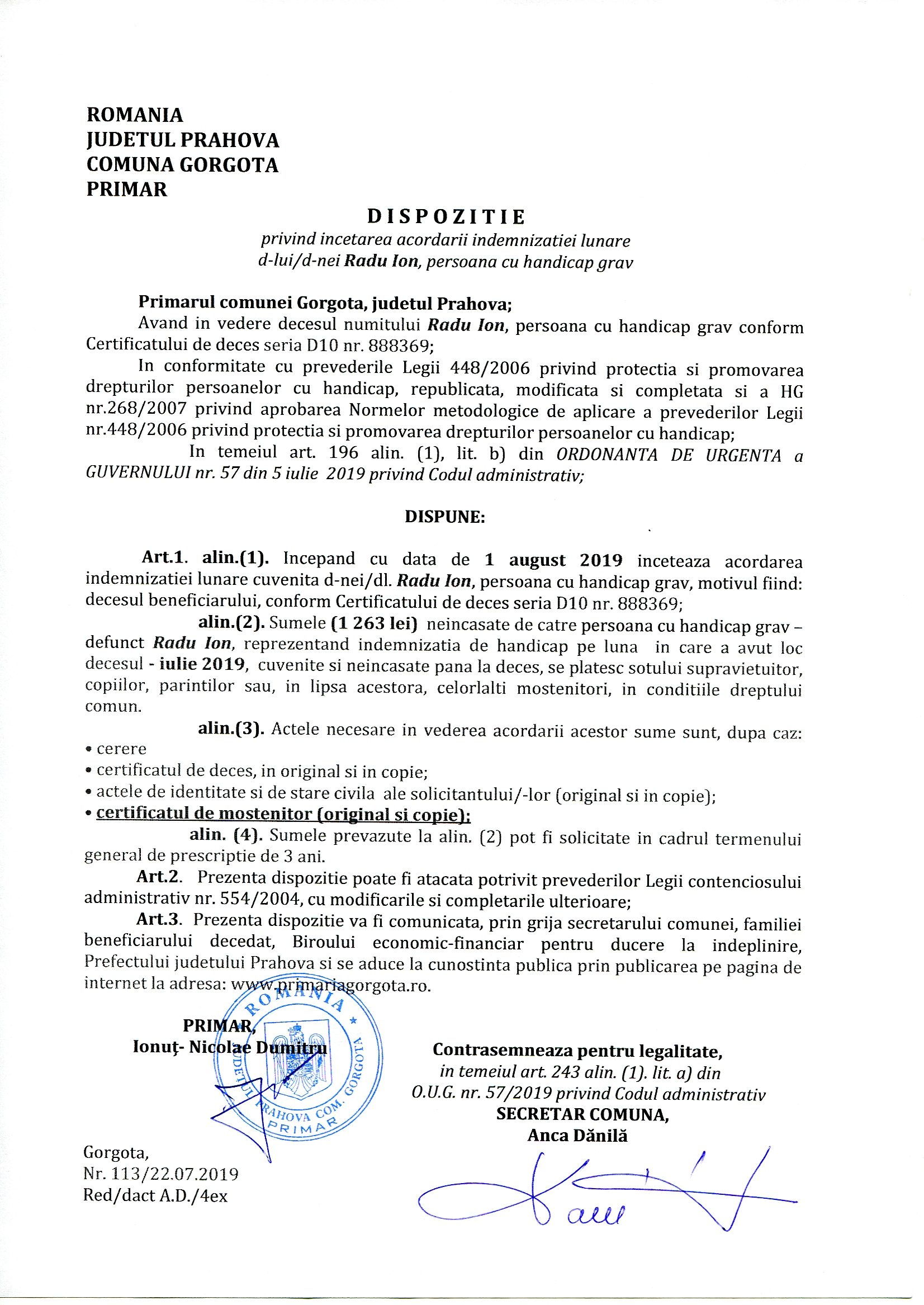 Dispozițiile primarului ➠ Dispoziția nr.113 din 2019 privind încetarea acordării indemnizației lunare domnului ..., persoană cu handicap grav